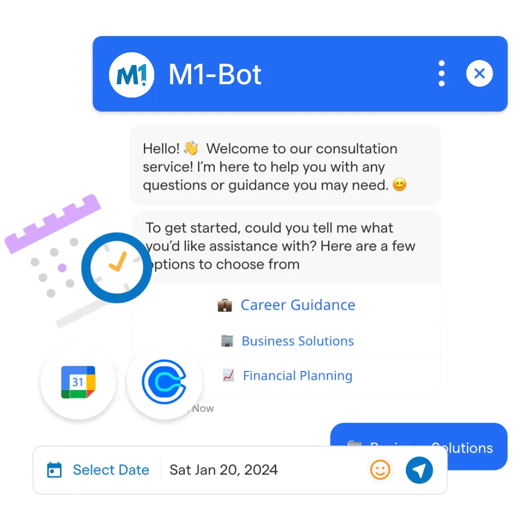 Qualified prospects can book discovery calls through chat. M1-Bot displays available time slots with specific consultants, confirms bookings and sends reminders so scheduling doesn't depend on manual coordination.
