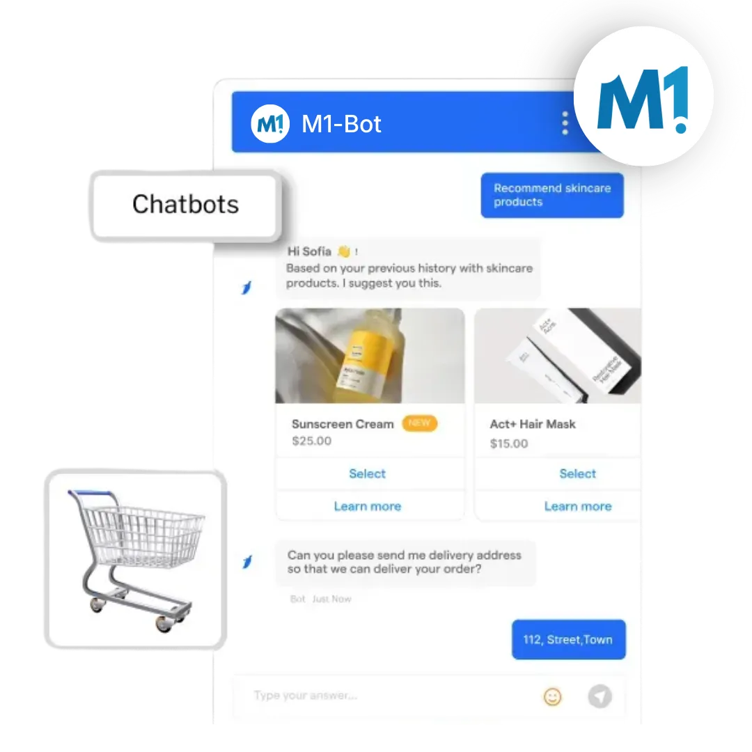 M1-Bot handles customer conversations that come into a retail or e-commerce business through chat. It replies to common questions, helps customers track orders, recovers abandoned carts and routes complex enquiries to the right team member. It supports retail teams by taking care of routine conversations, not replacing people.
